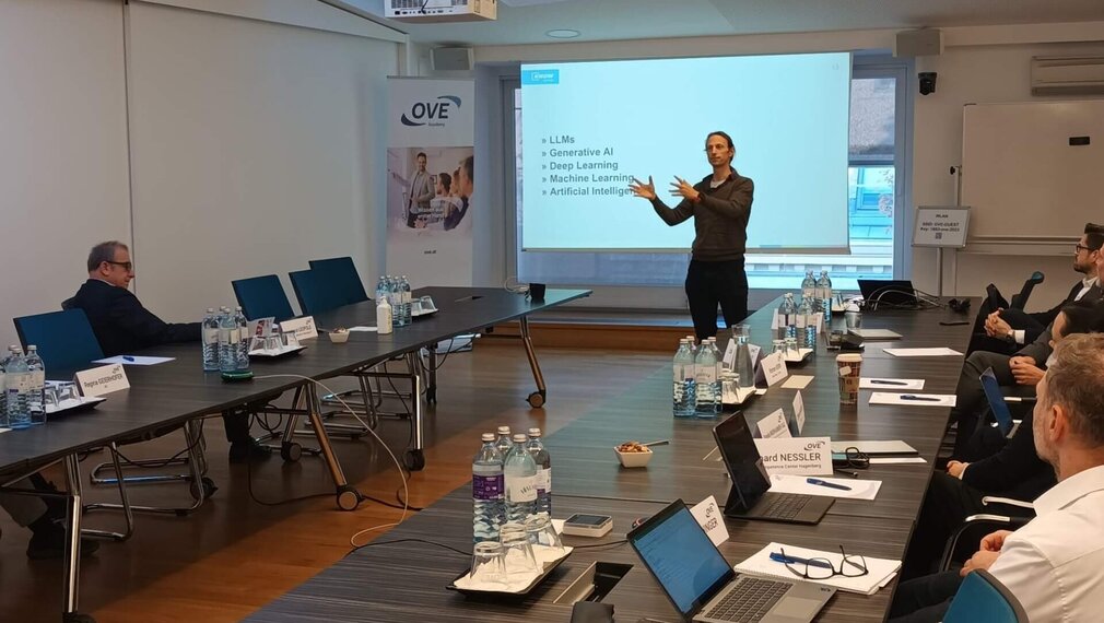 Im Anschluss stand ein Impulsvortrag zu konkreten Anwendungsfällen am Programm: Florian Ainhirn (Wiener Netze) stellte anhand zweier Use Cases den Einsatz von Künstlicher Intelligenz zur Optimierung der Übertragungskapazität bei Hochspannungskabeln vor.