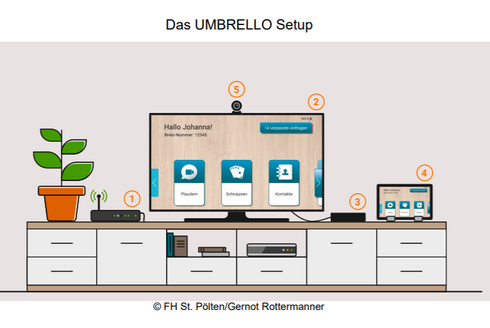 Die Basis von UMBRELLO ist eine TV- und tablet-basierte Plattform, die im Rahmen der Vorgängerprojekte (Brelomate 1 + 2) entwickelt und in einer ausführlichen Feldstudie in 40 Haushaltgen getestet wurde. Das Setup macht den Fernseher zum benutzer/innenfreundlichen Herzstück der Digitalen.Dorf.Dienste. Für den Aufbau zu Hause werden nur wenige Komponenten benötigt (Abb. 1):