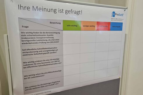 In regelmäßigen Abständen fanden im Rahmen des Projekts ProSafE² Workshops statt. Das Projekt ProSafE² befasste sich mit der Entwicklung von Grundlagen für eine periodische, routinemäßige Sicherheitsüberprüfung von Gleichstrom-Ladestationen. Ziel der Stakeholder-Workshops war es, die Branche in das Projekt einzubinden und gemeinsam offene Fragen zu diskutieren.