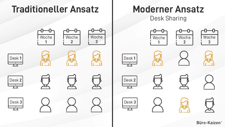 Viele Desksharing-Konzepte resultieren daraus, dass es weniger Arbeitsplätze als Mitarbeiter:innen gibt. Auslöser für die Einführung des Modells war die Beobachtung, dass Büroarbeitsplätze aufgrund von Urlaub, Krankenstand, Homeoffice oder einfach nur Besprechungen häufig nur zu 70 % besetzt sind.