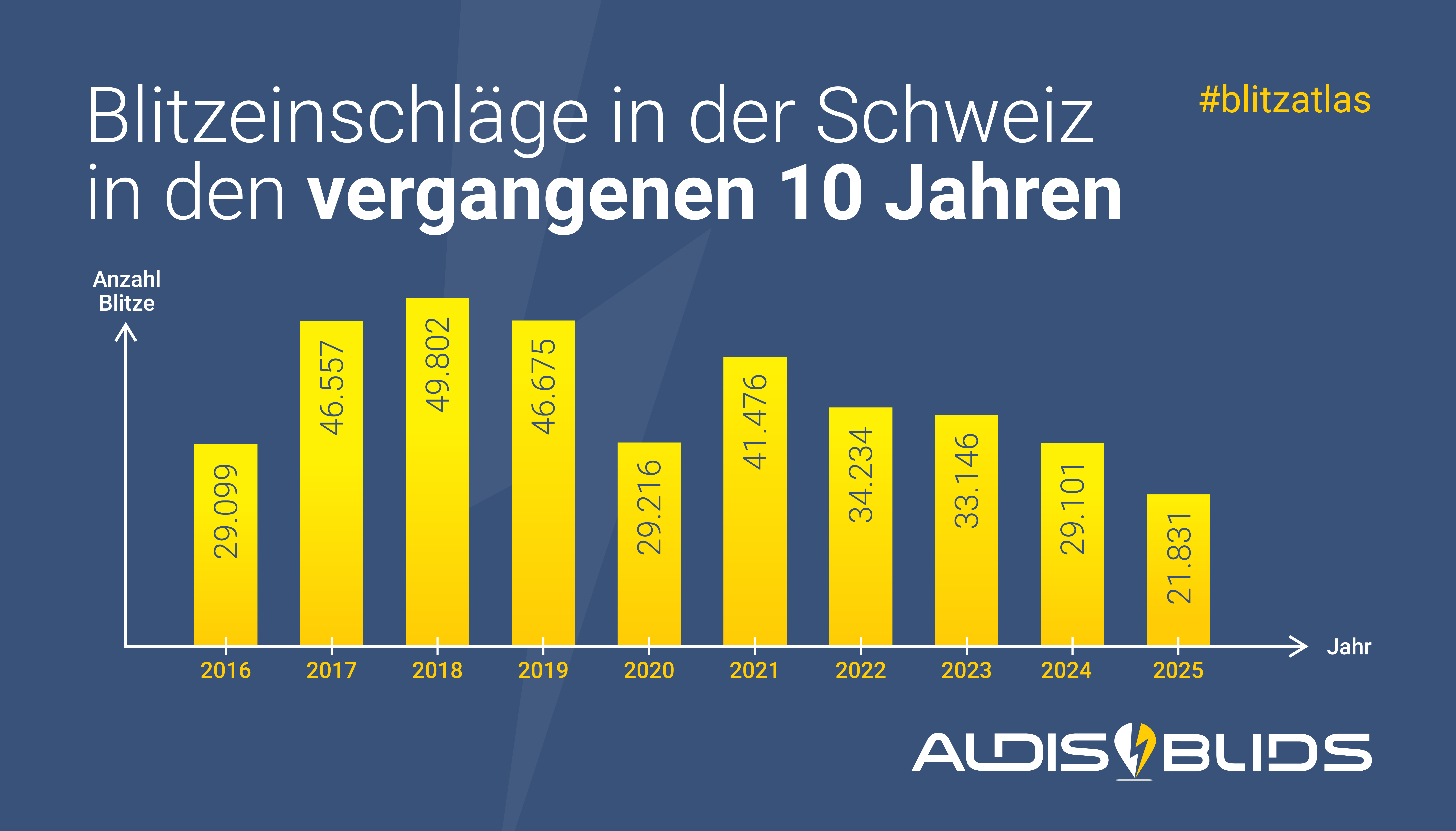 In Österreich sind 2025 so wenige Blitzeinschläge gemessen worden wie noch nie. Insgesamt hat der Blitz-Informationsdienst ALDIS/BLIDS im ganzen Jahr nur 45.000 Erdblitze (Wolke-Erde-Blitzschläge) registriert, das waren um 55 % weniger als im Jahr davor. Dies geht aus dem aktuellen Blitzatlas mit Messungen aus allen 94 Bezirken hervor. Österreichischer Blitz-Hotspot war Graz.