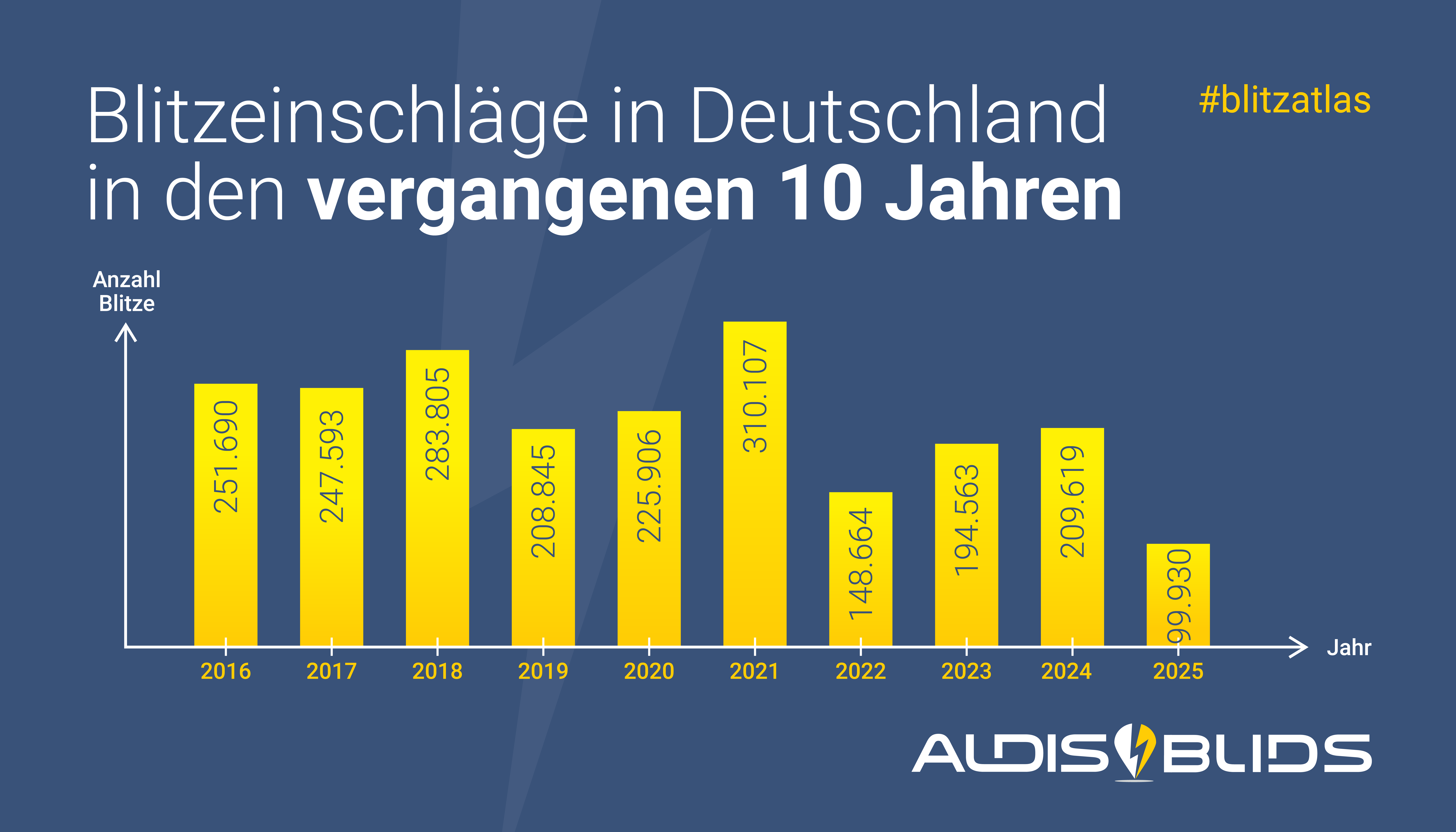 2025 sind in Deutschland so wenige Blitzeinschläge gemessen worden wie noch nie. Insgesamt hat der Blitz-Informationsdienst ALDIS/BLIDS im ganzen Jahr nur 100.000 Erdblitze (Wolke-Erde-Blitzschläge) registriert, das waren um 50 % weniger als im Jahr davor. Dies geht aus dem aktuellen Blitzatlas mit Messungen aus allen 402 Land- und Stadtkreisen hervor. Deutsche Blitzhauptstadt 2025 war Kaufbeuren.