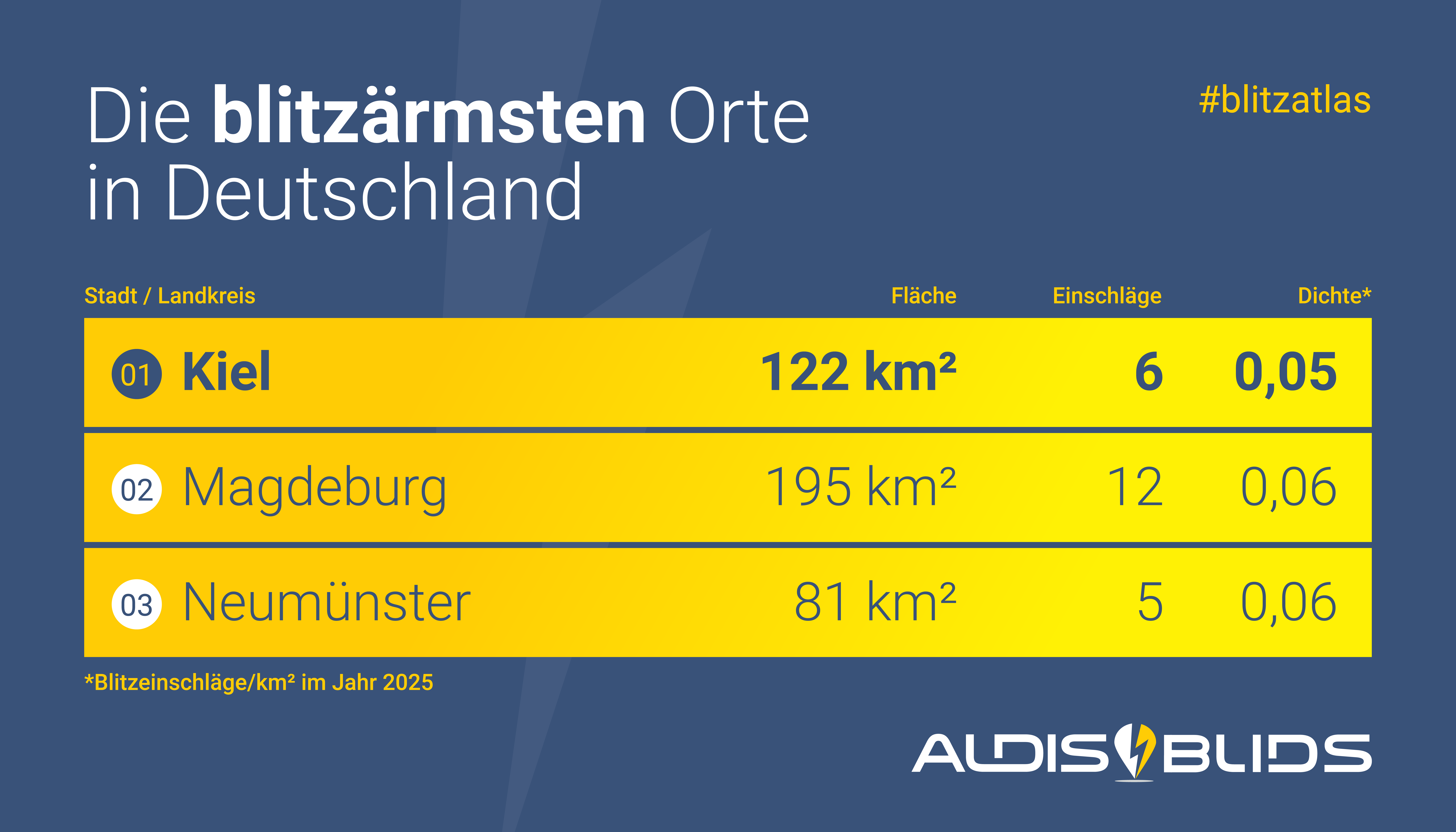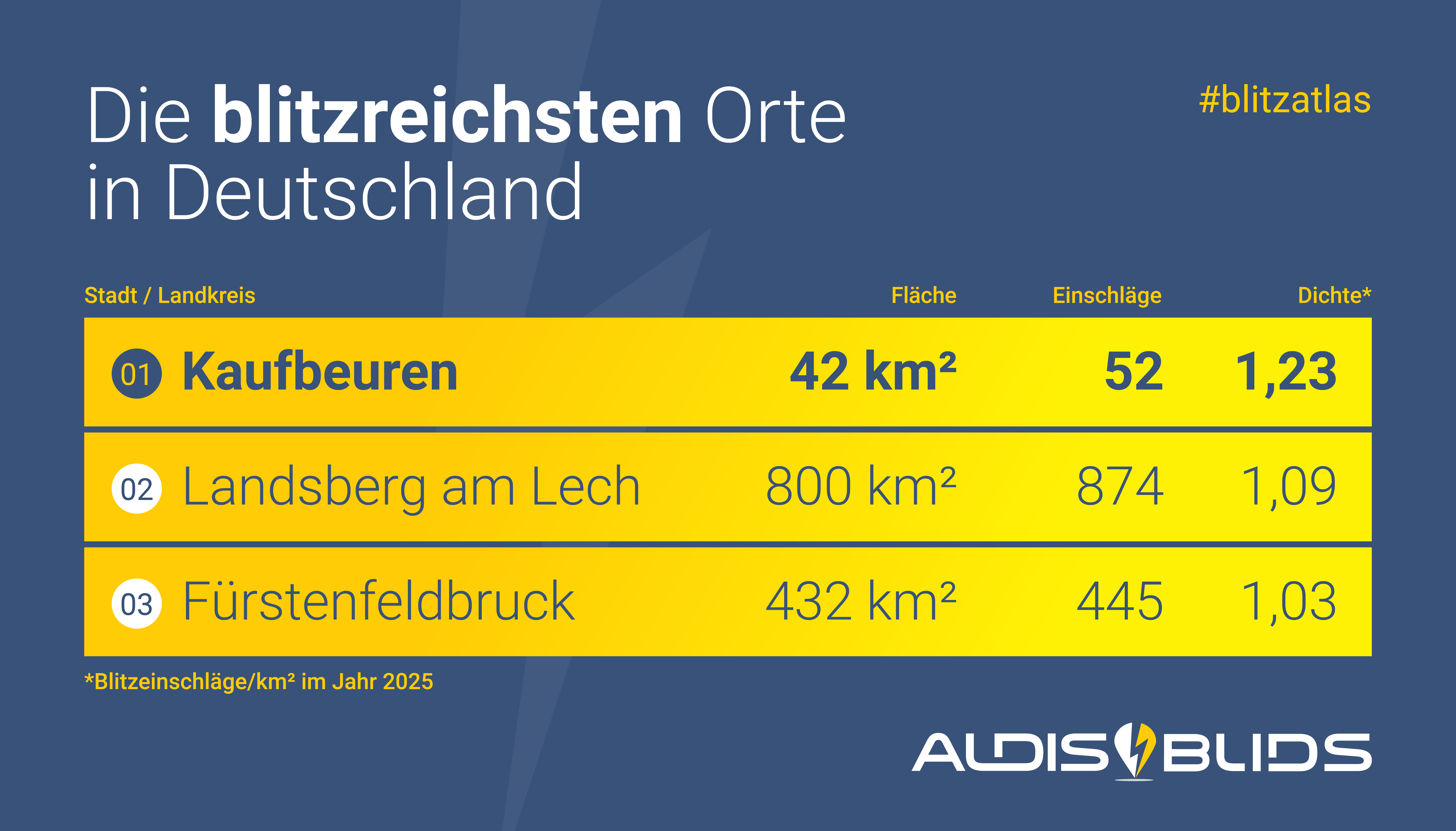 Mit 1,23 Blitzeinschlägen pro Quadratkilometer liegt Kaufbeuren im Jahr 2025 an erster Stelle bei der Blitzdichte, gefolgt von Landsberg am Lech (1,09) und Fürstenfeldbruck (1,03). Die geringste Blitzdichte ermittelte ALDIS/BLIDS in den Städten Kiel mit 0,05 Blitzereignissen pro Quadratkilometer sowie in Magdeburg (0,06) und Neumünster (0,06). Unter den Landeshauptstädten führt München mit einer Blitzdichte von 0,61 die Liste an, gefolgt von Wiesbaden (0,47) und Bremen (0,23).