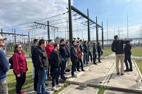 Nach einer kurzen Sicherheitsunterweisung ging es zum gemeinsamen Mittagessen in die WerXkuchl, dem Betriebsrestaurant der Wiener Netze. Gestärkt und voller Motivation ging es mit dem Bus zuerst zum Umspannwerk Südost im 10. Bezirk, dem größten Umspannwerk in Wien, das gemeinsam mit der APG Austrian Power Grid AG betrieben wird. Das Umspannwerk besteht aus Freiluftschaltanlagen für 380 kV, 220 kV und 110 kV mit mehreren Sammelschienen. Daneben befinden sich mehrere Netzkuppeltransformatoren, die ebenfalls besichtigt wurden.