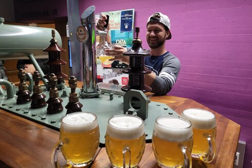 Den Abschluss der Vortragsreihe machte der Leiter des Instituts für Regelungs- und Automatisierungstechnik, Dr. Martin Horn, mit einem Vortrag zu den Anwendungsgebieten der Regelungstechnik für die optimierte Herstellung von pharmazeutischen Produkten. Mit dem letzten fachlichen Input des Abends hatte Professor Horn auch gleichzeitig die schwierigste Aufgabe, denn sein Vortrag lag zwischen hungrigen und durstigen Young Engineers und 300 belegten Brötchen und perfekt temperierten hopfenangereicherten Elektrolyt-Getränken, gezapft aus dem legendären HSZS-Zapftrafo. Doch auch diese Herausforderung konnte bewältigt werden!
