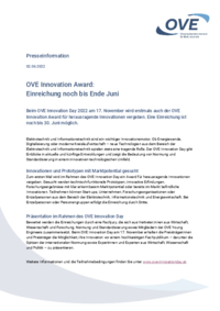 Presseinformation 02.06.2022 OVE Innovation Award: Einreichung noch bis Ende Juni Beim OVE Innovation Day 2022 am 17. November wird erstmals auch der OVE Innovation Award für herausragende…