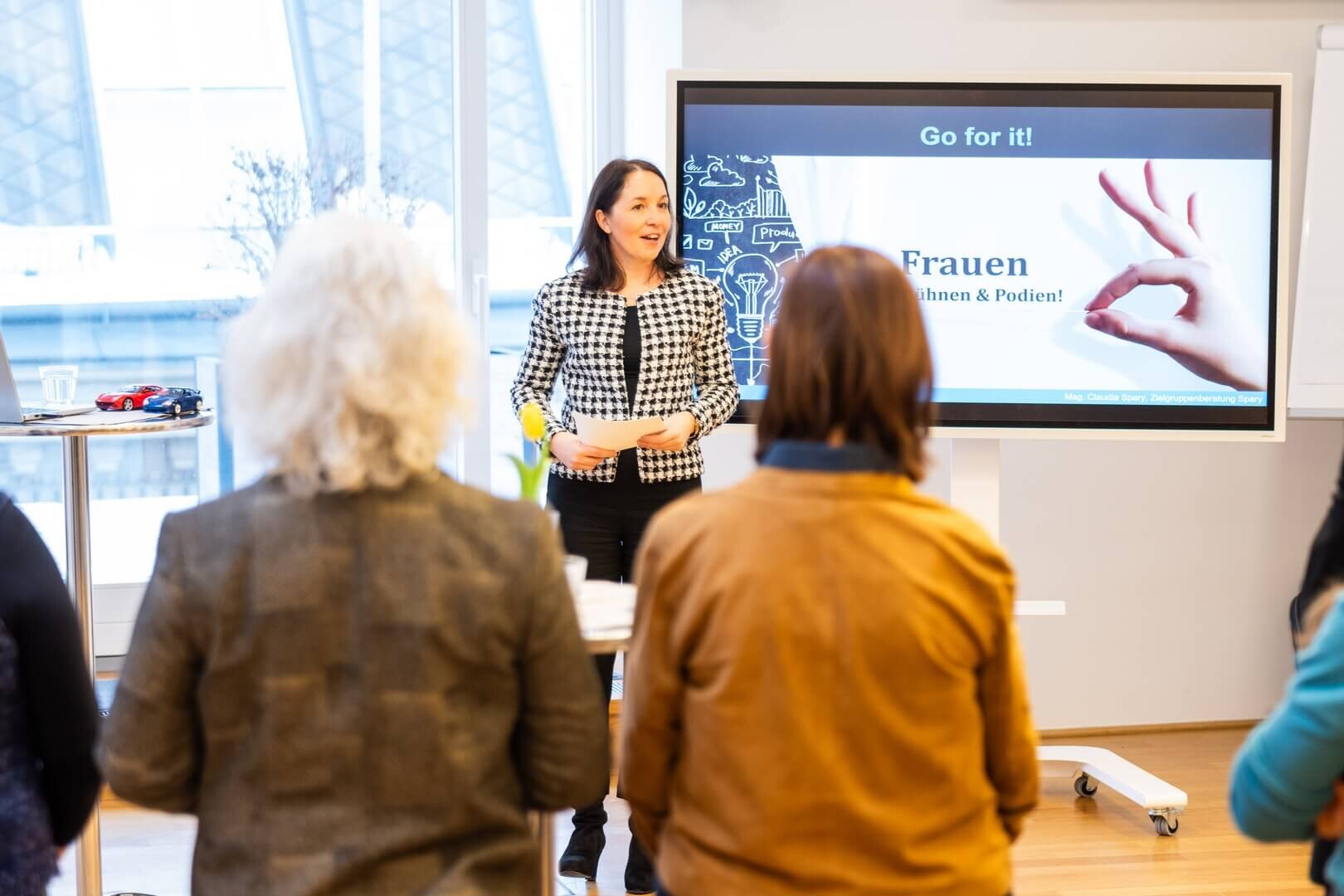 Im Anschluss übernahm Michaela Leonhardt das Wort und leitete zum inhaltlichen Schwerpunkt des Vormittags über: Claudia Spary – Moderatorin, Beraterin, Coach und Speakerin – beschäftigte sich in ihrem Vortrag damit, wie Frauen Vortragsbühnen für sich erobern und aktiv für ihre Karriere nutzen können. Dabei führte die Expertin eindrucksvoll aus, dass Vortragstätigkeit ein wesentlicher Hebel für berufliche Sichtbarkeit ist: Wer auf der Bühne steht, erhöht nicht nur seine Präsenz in der Branche, sondern erweitert auch sein Netzwerk. Besonders betonte sie, dass das Verlassen der eigenen Komfortzone Wachstum und persönliche Entwicklung ermöglicht.