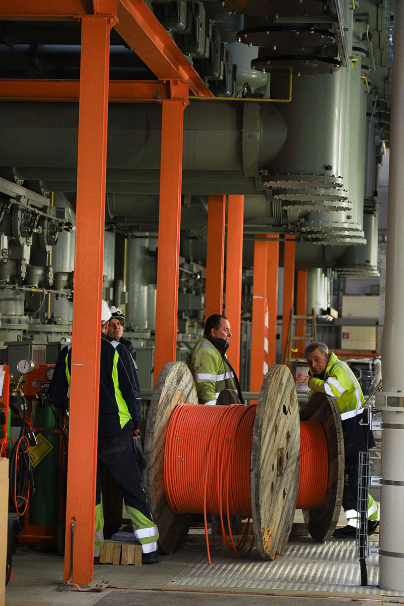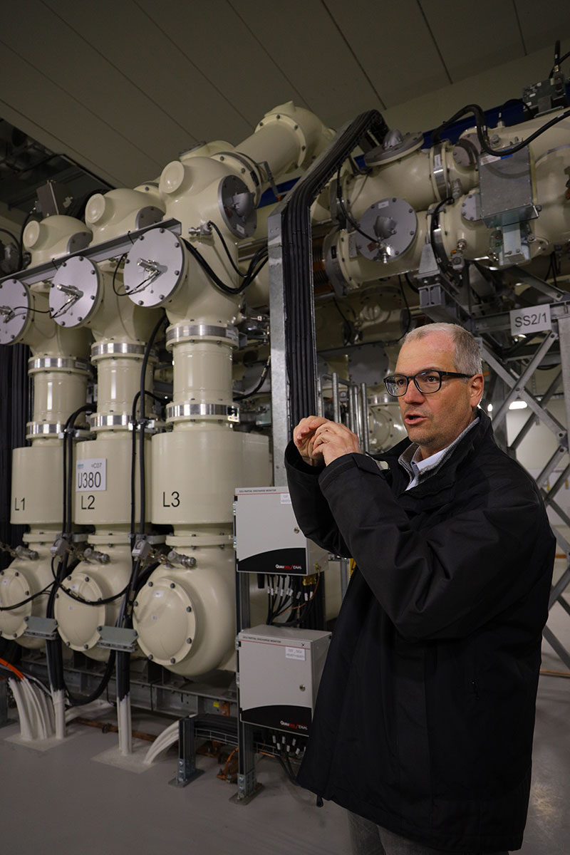 Anschließend stand ein Vergleich zwischen der alten, mittlerweile stillgelegten Schaltanlage und der neuen GIS-Schaltanlage auf dem Programm. Besonders interessant: In der neuen Anlage werden die Phasen getrennt geführt, während sie in der alten Ausführung noch gemeinsam in einem Rohr verlaufen sind. Zum Abschluss besichtigte die Gruppe eine bereits in Betrieb befindliche Kompensationsdrossel, die künftig durch weitere ergänzt werden soll.